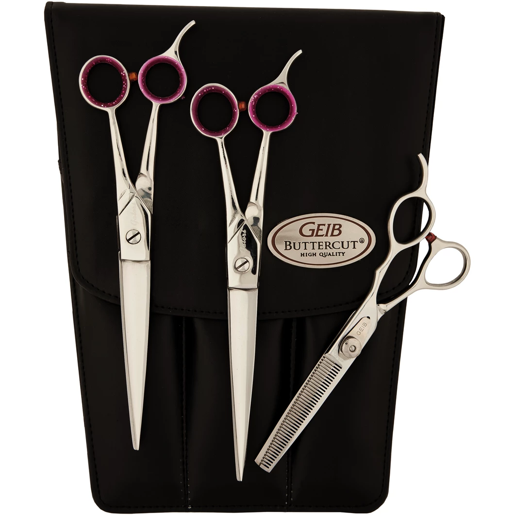 Gator shear pet grooming kit. Shears are made from a high quality stainless steel alloy. Double-screw tension produces smooth scissoring. Packaged in a high-quality cordovan vinyl case. Kit includes 7.5″ straight shear, 7.5″ curved shear, and one 6.5″ 42 tooth thinning shear.Â