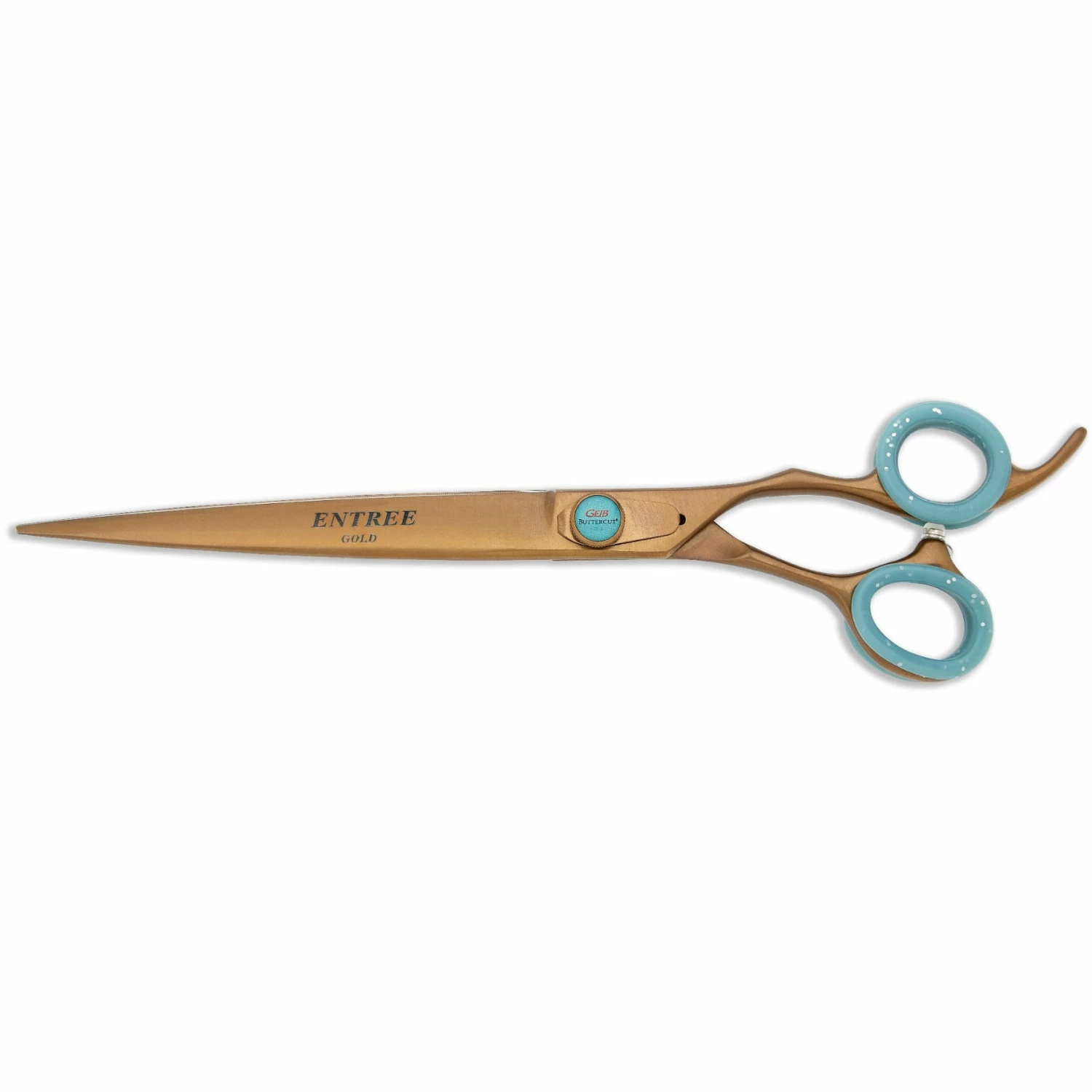 Entree Gold ShearsΒ 440C Japan Stainless Steel; Strong fell and cut and long lasting; Semi Convex Edge; Perfect for everyday grooming; Tension balancing spring