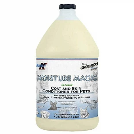 Moisture Magic Conditioner by Groomer’s Edge is the perfect remedy for dry, brittle coats! Enriched with aloe, vitamin E and panthenol to add moisture to hair and skin. Fresh, clean fragrance. Use Moisture Magic full strength for maximum benefit, or as a rinse. Gallon size of conditioner dilutes 10:1.